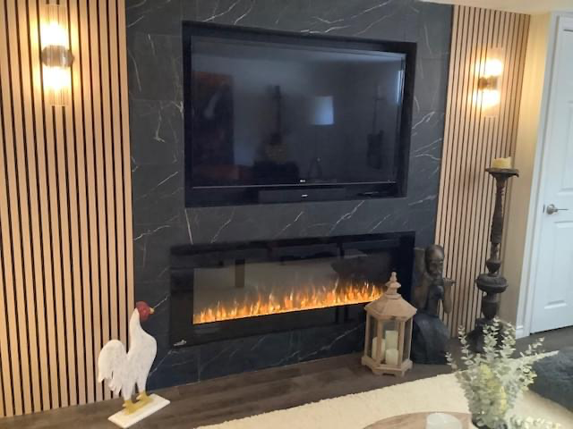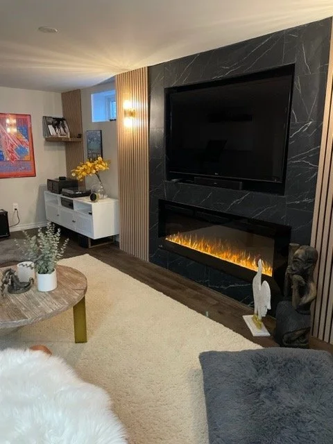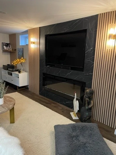 This inviting basement renovation brings a fresh interpretation of the home’s existing design style while introducing a warm caramel colour palette. A striking linear electric fireplace wall anchors the space, finished with floor-to-ceiling tile and framed by maple wood slat detailing and elegant sconces. Existing luxury vinyl flooring was complemented with a plush area rug to enhance comfort. Designed as a multifunctional retreat, the rec room blends media, music, and relaxation areas into a cohesive, stylish space.